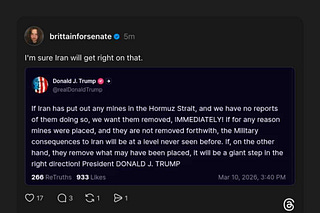Though we don’t know why we’re at war with Iran, precisely, we’ve figured out why we haven’t won yet: because they’ve locked down the Strait of Hormuz…