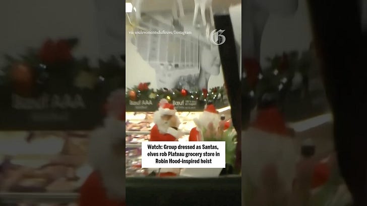 Three Santas and 40 elves were counted among those looting a grocery store in Montreal on Monday, watched by shocked workers and customers.