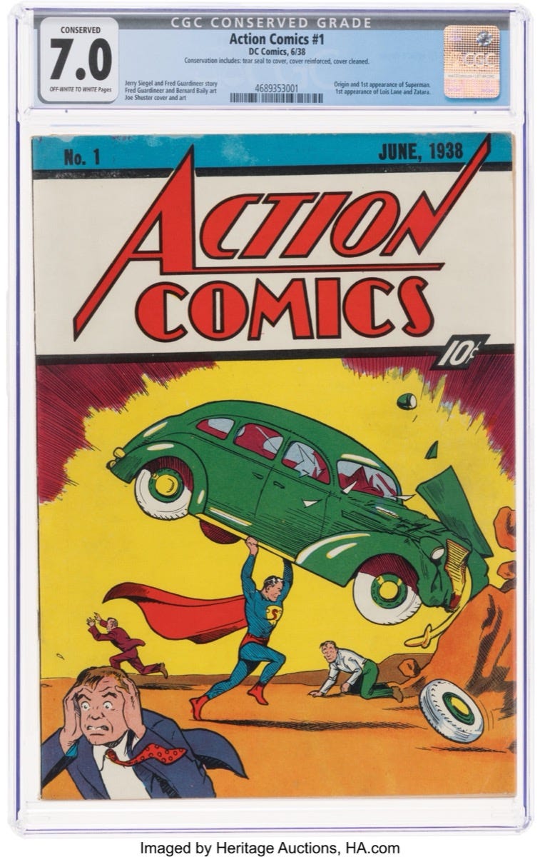 In the early 1980s, a collector with limited funds was scanning auction catalogs and phoning in small bids, hoping something overlooked would slip through. One day the phone rang: his was the highest bid on Action Comics No. 1 — Superman’s 1938 debut and the permanent No. 1 on the Overstreet Comic Price Guide. He’d bid less than half its value. They off…