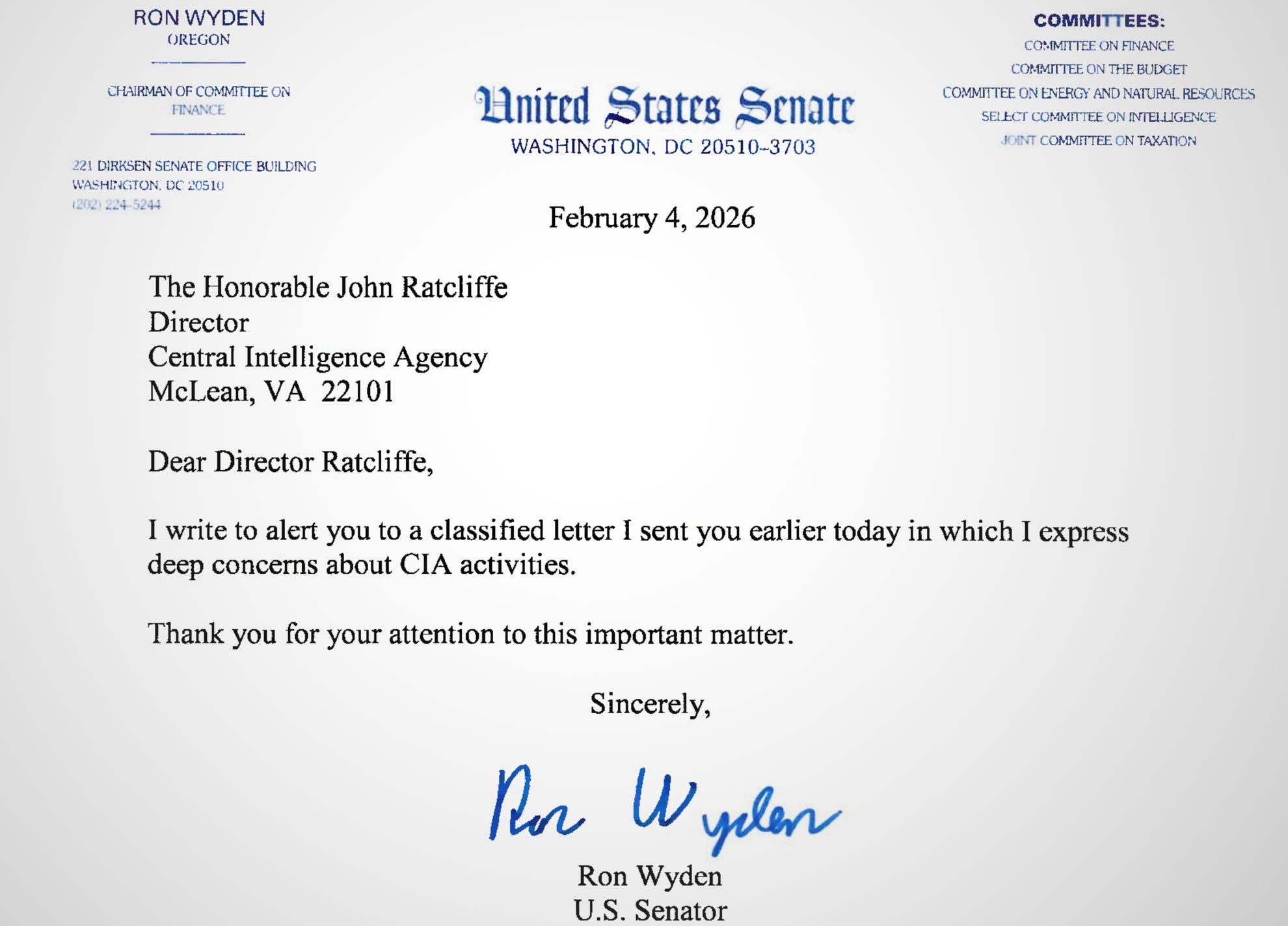 “I write to alert you to a classified letter I sent you earlier today in which I express deep concerns about CIA activities,” is the entirety of the letter, but for pleasantries. Wyden, representing Ore…