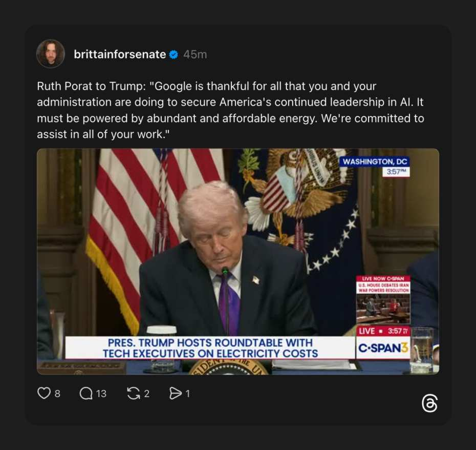 Alphabet President and Chief Investment Officer Ruth Porat kissed Trump’s butt so ferociously that it looks like she is trying out for a cabinet position. Porat was startlingly deferential to Donald Trump, thanking him for securing U.S. leadership in AI and promising that Google is “committed to assist in all of your work.”