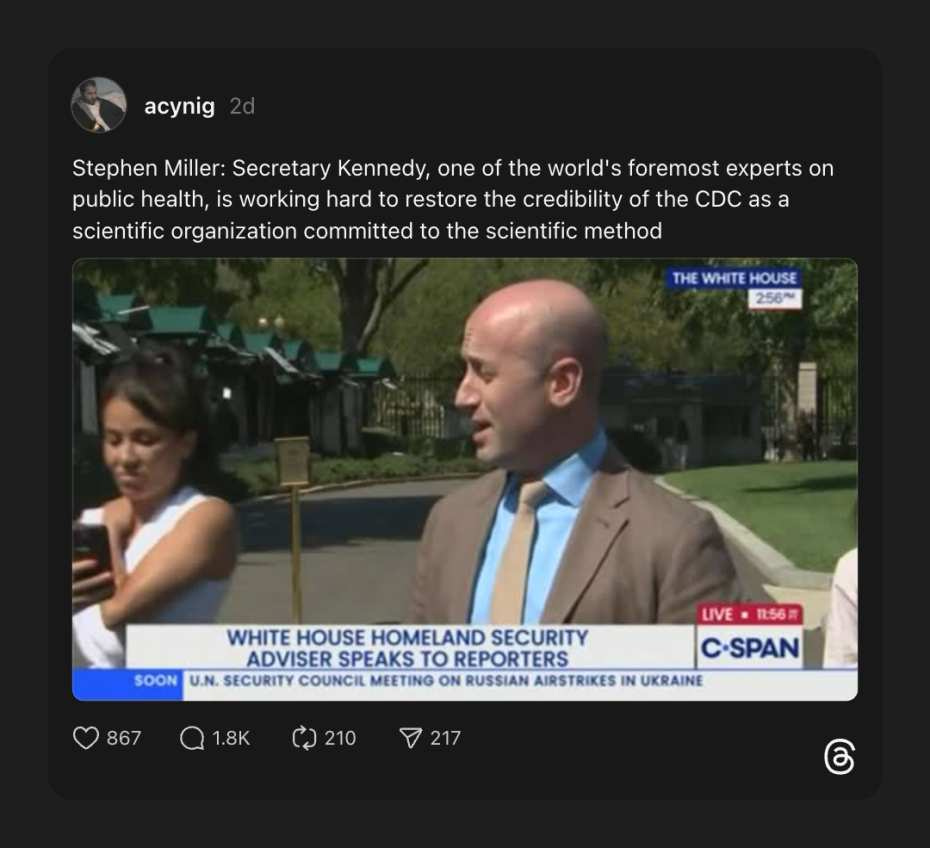 Donald Trump's ghoul, mayonnaise-fueled Stephen Miller, portrays Robert F. Kennedy Jr's dismantling of the infrastructure we rely on for public health as some shining stand for truth and science, rather than a turn towards ignorance and death.