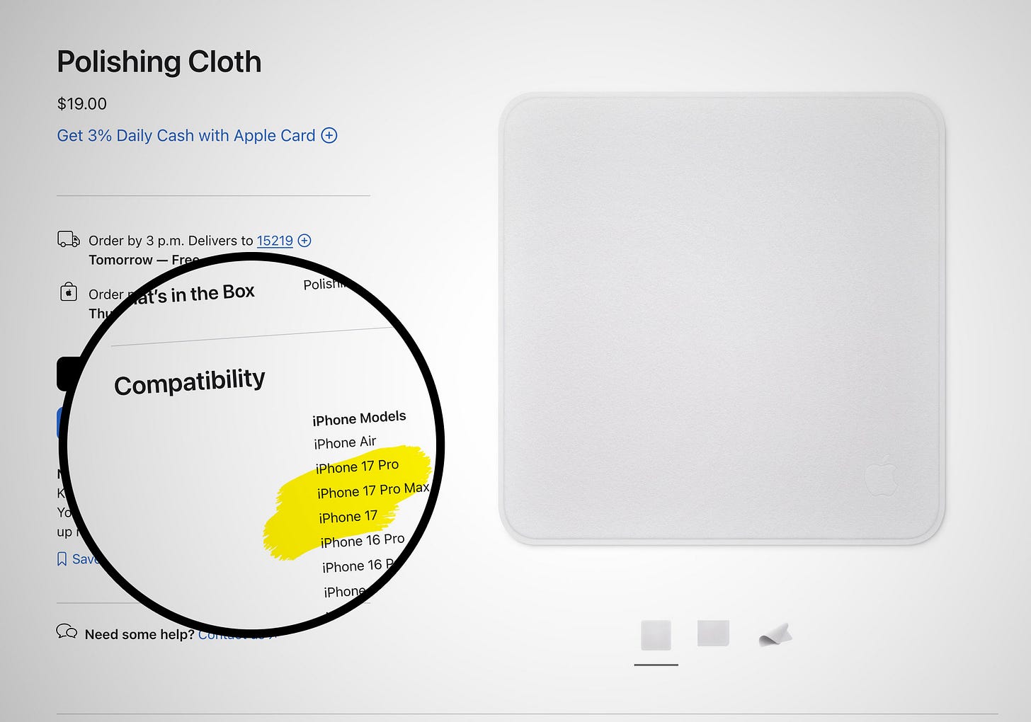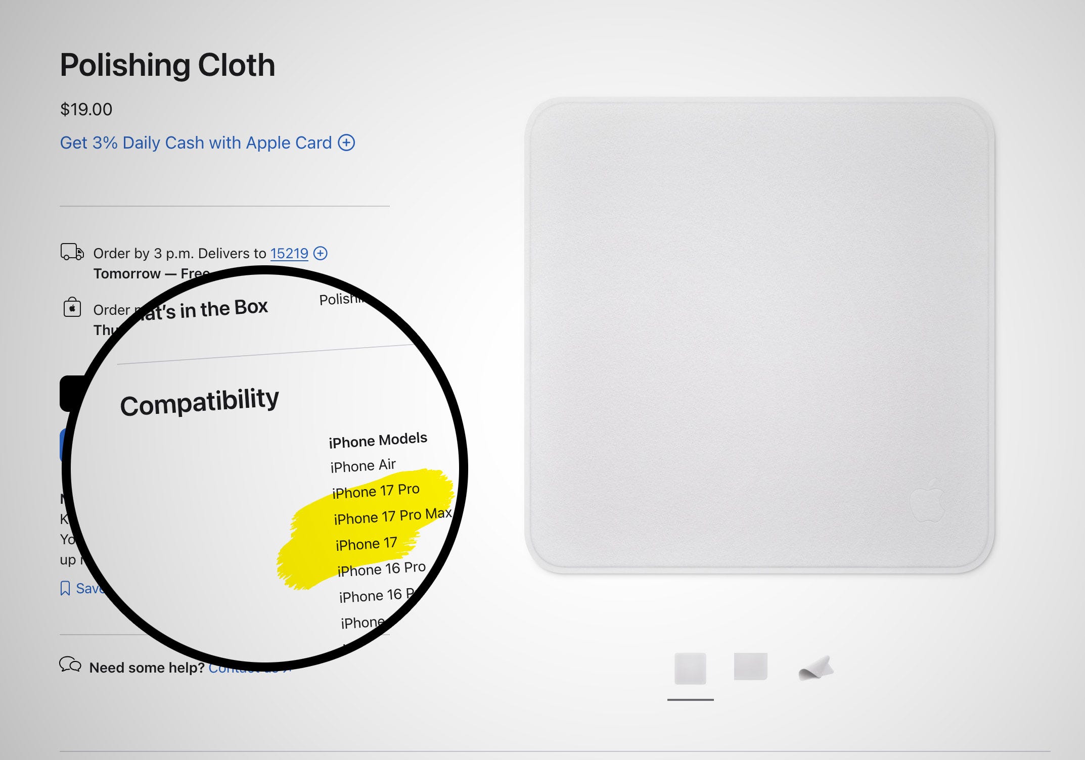 Reporting updates to the official compatibility list of the Apple Polishing Cloth may already be a cliché, but it's a funny one. And the new Apple gadgets bring with them a bumper crop of updates for the soft, cleansing $19 peripheral: added to the list are the iPhone 17, the iPhone Air, the iphone 17 Pro , and the new Apple Watch models.
