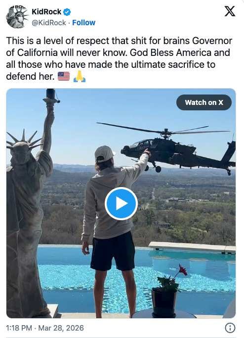 The Army has suspended pending investigation a helicopter crew after two Apache gunships buzzed Kid Rock’s house in a viral stunt that looked less like military training and more like a private flyover for a MAGA celebrity.