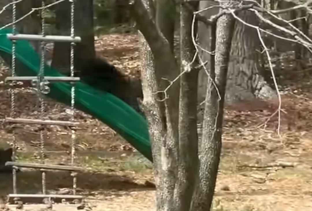 In this footage, a woman exclaims "Oh my goodness" as she watches a bear climb into a family playhouse and plunge merrily down the slide. The Associated Press got in touch with Sarah Loving, who explained the charming if slightly alarming sight.
