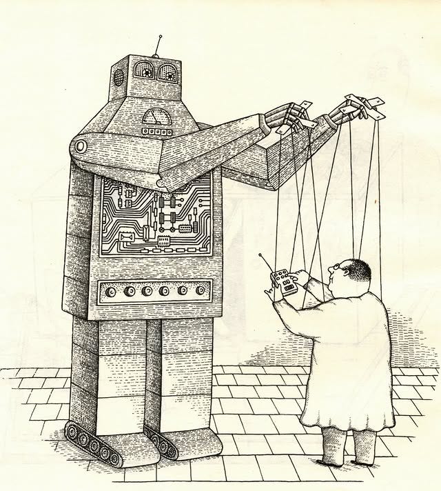 In this 1987 cartoon by Bulgarian artist Milen Radev, an engineer operates a wireless remote control to command a towering robot— but the robot’s mechanical hands grip puppet strings attached directly to the engineer himself. Who’s really in control?