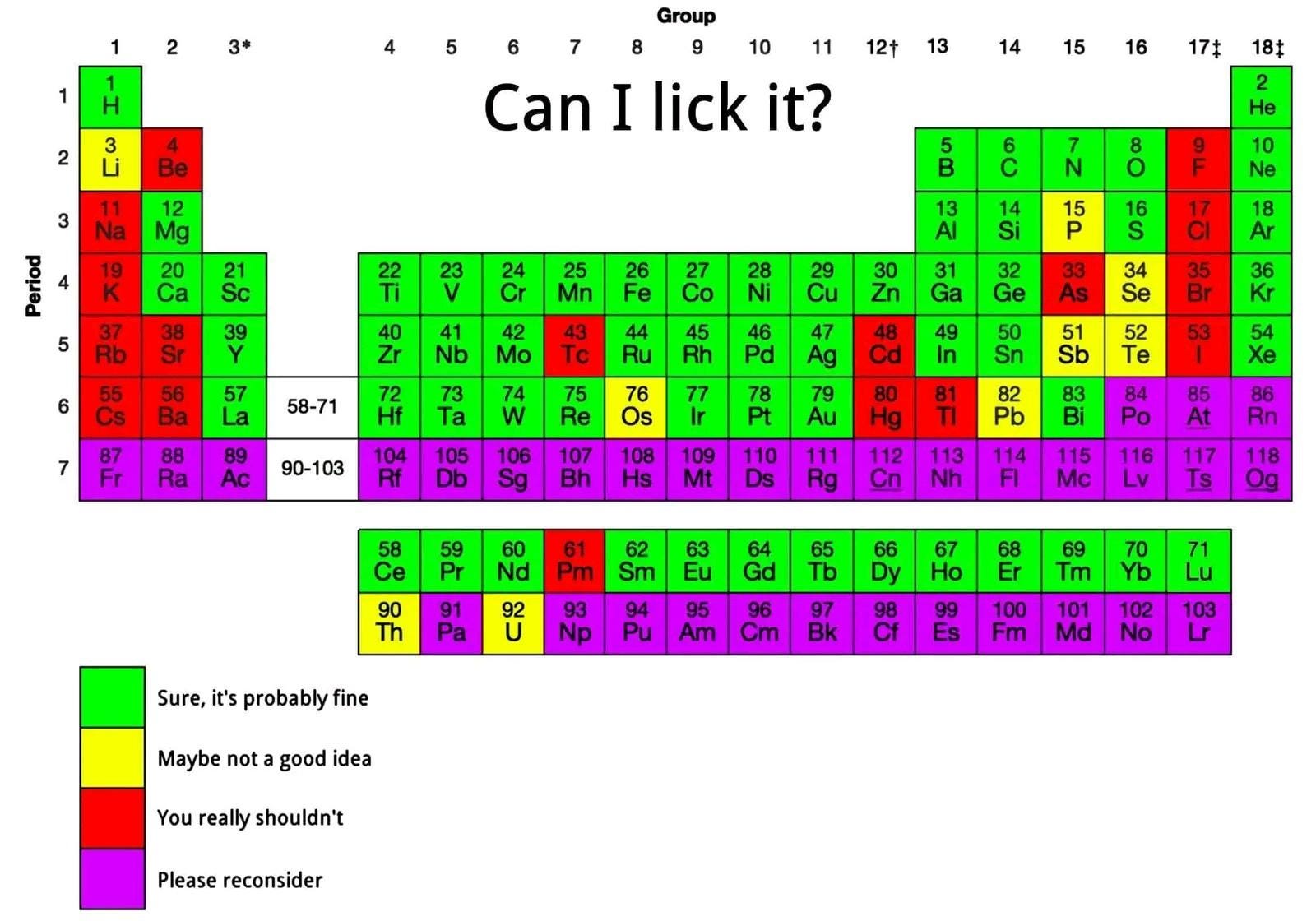 Can I lick it? is the periodic table of elements as befits the table where you eat. It’s been so widely copied that the original is hard to discern, but this image on Imgur [via Jason Kottke] might be it. Some of its conclusions strike me as suspiciously encouraging: I would not lick uranium under any circumstances. Or calcium! It’s now incarnated in ev…