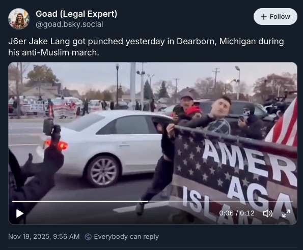 Pardoned J6er Jake Lang, the Capitol riot figure turned Senate candidate, got an unexpected lesson in momentum Saturday when someone marching next to him threw a clean right hook into his face during a march. Video shows Lang recoiling, eyes wide, mid-chant.