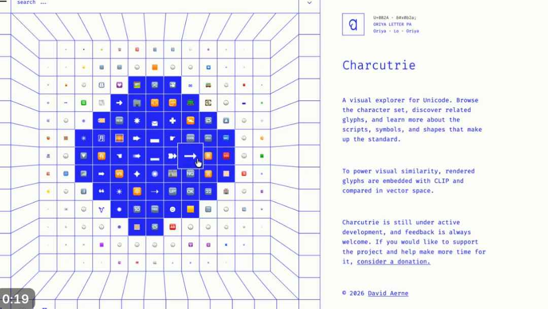 Charcuterie is a perfectly-named visual exploration tool for finding the exact Unicode character you want. Whichever one you click on, it’ll fill the screen with similar sigils. You can also sketch one that came to you in a fever dream, and it will find it. David Aerne: