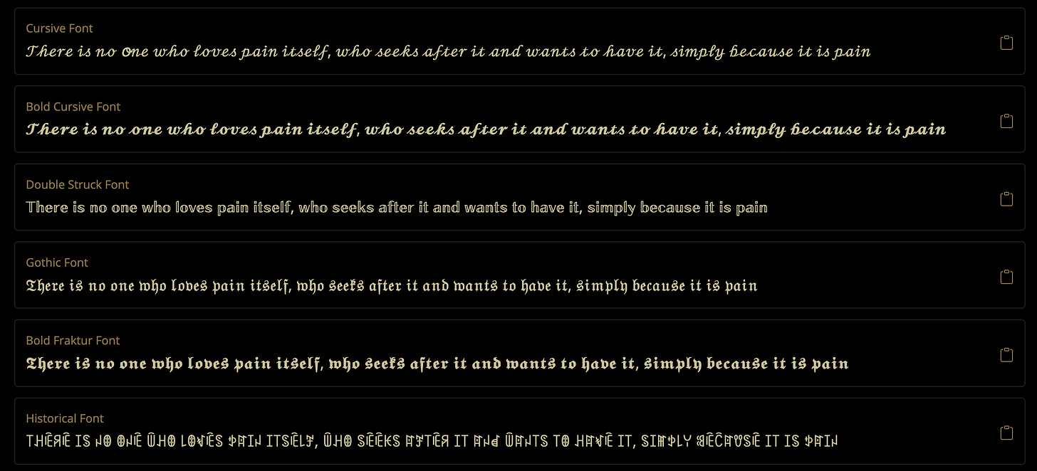 Q and Z (formerly at Panix) is a hidden pillar of the old web, converting text to appear to be upside-down, in a ππ©ππ π¨π©π’π±π±π’π― typeface, β±€π΅πππ, or anything else made possible through zillions of Unicode alternatives. Fontgenerator.cool is a new and more modern site offering even more options for κ§β’βΈ embellishing βΈβ’κ§ text. [via Hacker News]