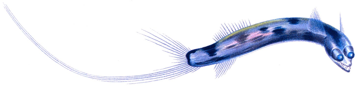 Deep in the ocean's twilight zone dwells the nightmarish telescopefish. This sea creature looks more like a demon from a horror film than anything else I've seen in nature. It has a Labubu-esque mouth and telescopic eyes that hunt in the darkness, and resemble pearls devoid of pupils.