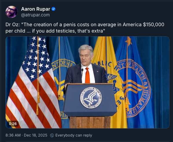 In the wake of legislation moving to ban gender affirming care for patients under the age of 18, Doctor Oz joined vaccine denier RFK Jr to mark the occasion. Noting the cost of a penis as too high, Oz failed to observe that prices across the board have risen during Trump’s second Presidency.