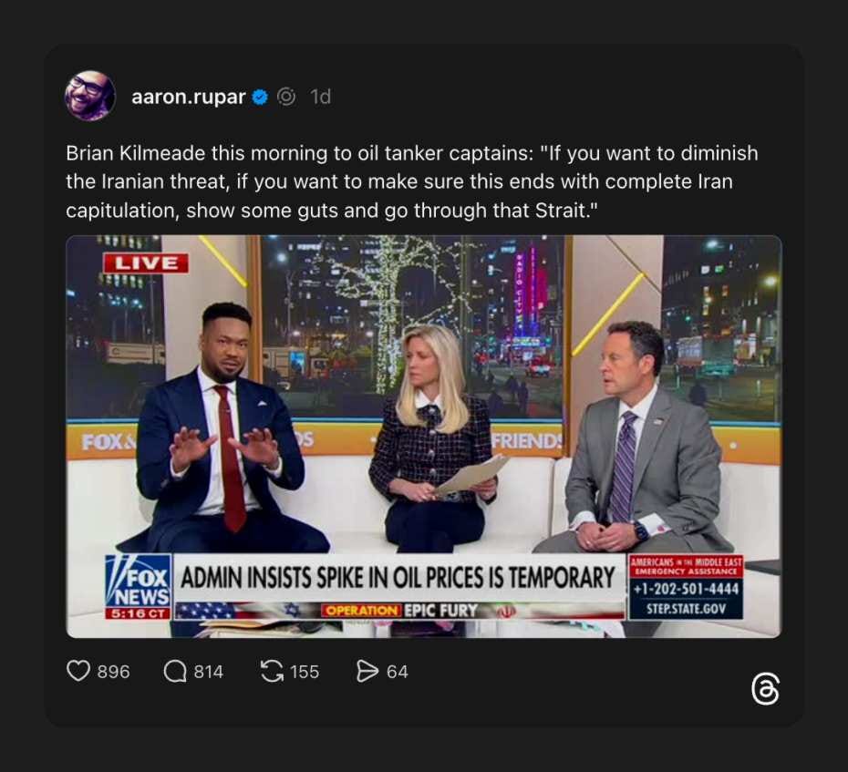 Fox’s Brian Kilmeade is once again showing he doesn’t think before he speaks. Insisting that tanker captains run the Strait of Hormuz during Trump’s war on Iran, Kilmeade risks environmental ruin and human lives to support an unjust war.