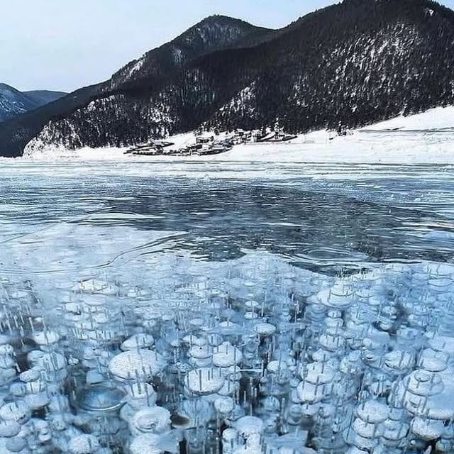 At first glance, this frozen lake looks like it’s full of neatly stacked UFOs hovering beneath the ice. What you’re actually seeing is methane gas released by bacteria as they decompose organic matter in the mud at the bottom. When winter ice forms quickly, the gas bubbles rise and get trapped. They freeze in place before they can escape, creating those…