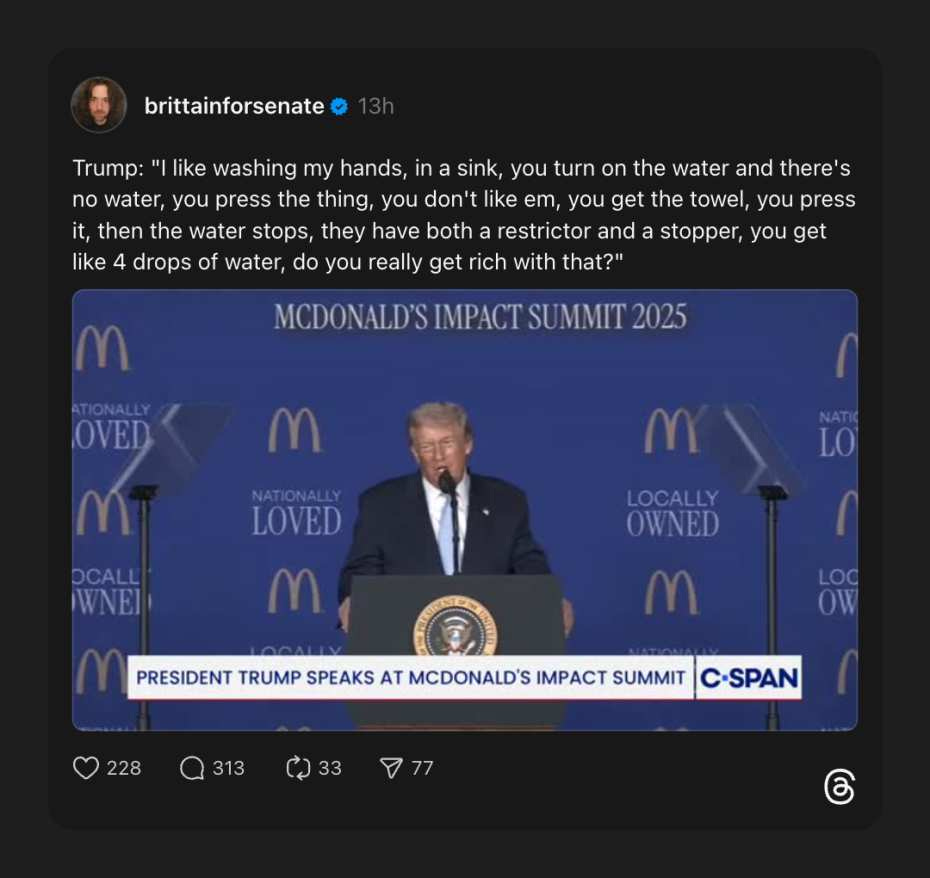 This stream-of-consciousness faucet fury targeted everything from motion-sensor taps to towel dispensers, culminating in the existential question: “Do you really get rich with that?” It wasn’t clear who “they” were or what riches he expected from a functioning bathroom, but the message was unmistakably clear: Trump is clearly aware of what he is saying, where he is, or what the job of President may require.