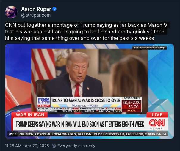 Famous for promising everything is a mere two weeks away, convicted felon Donald Trump has been continuously reassuring the world that his little adventure in Iran is or will be over any minute now. Welcome to week six with no end in sight.