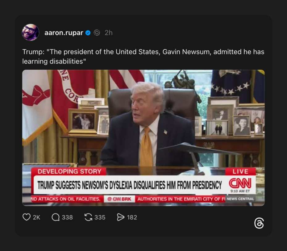 Perhaps the Orange Menace is showing us his grandest fear, a Gavin Newsom presidency. Perhaps he is just addled and can’t remember up from down. Here, the mumbling, often falling over his own words, and unable to get an idea out, sundowner makes fun of someone for admitting a learning disability.