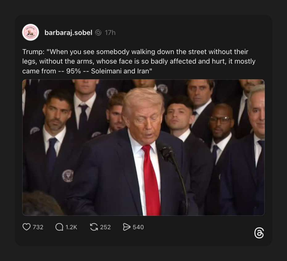 Looking tired and more than a little lost in his own anecdote, the Orange Menace loosed a rambling claim about people “walking down the street without their legs, without the arms,” insisting that 95% of those horrific injuries were somehow the work of Iranian general Qassem Soleimani.