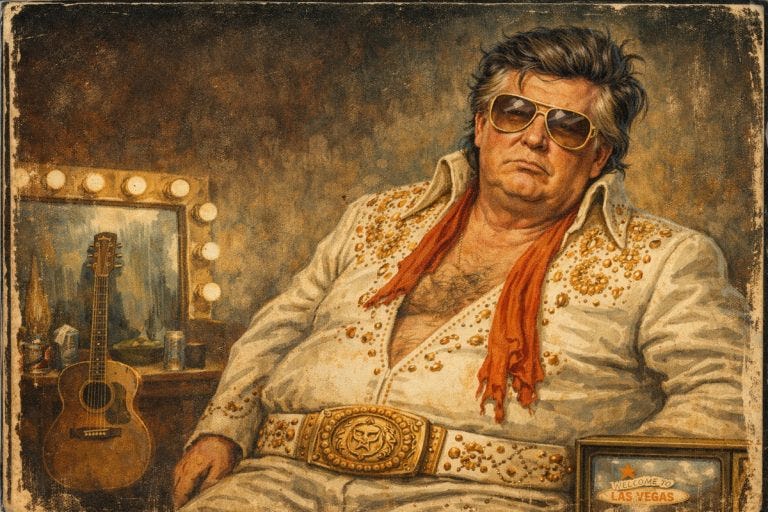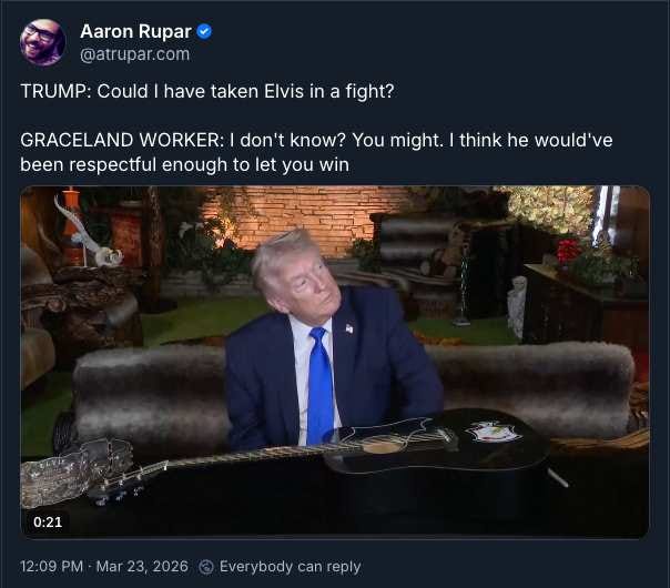 Sent to Graceland for some great getting-him-out-of-the-way honor, Grandpa Pudding Brains shows he still has a quick mind and is focused on what makes America great: if he could have beaten Elvis in a fight. Sadly, Donald doesn’t seem to understand what winning a fight means, or he wouldn’t think he’s already won something in Iran.