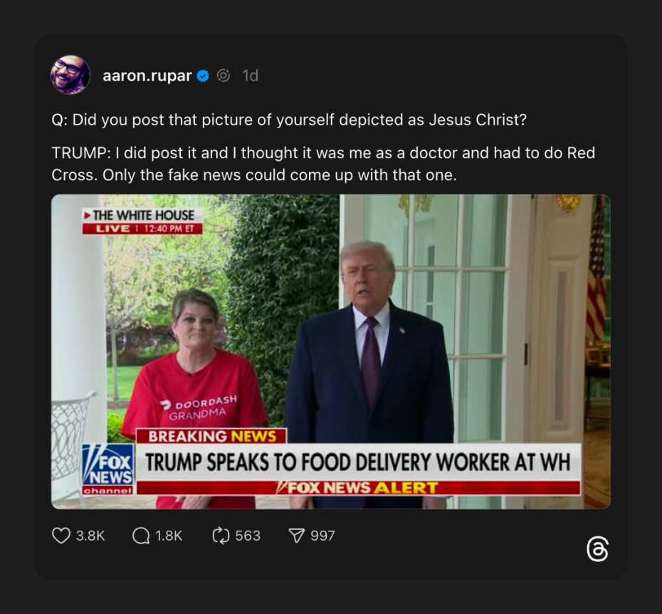 Choosing to share an AI-generated image of himself, apparently as Jesus and clearly faith-healing some poor soul who couldn’t afford US healthcare, Grandpa Puddin’ Brains claimed he thought it depicted him as “a doctor.” Clearly, Trump has been seeing some weird doctors.