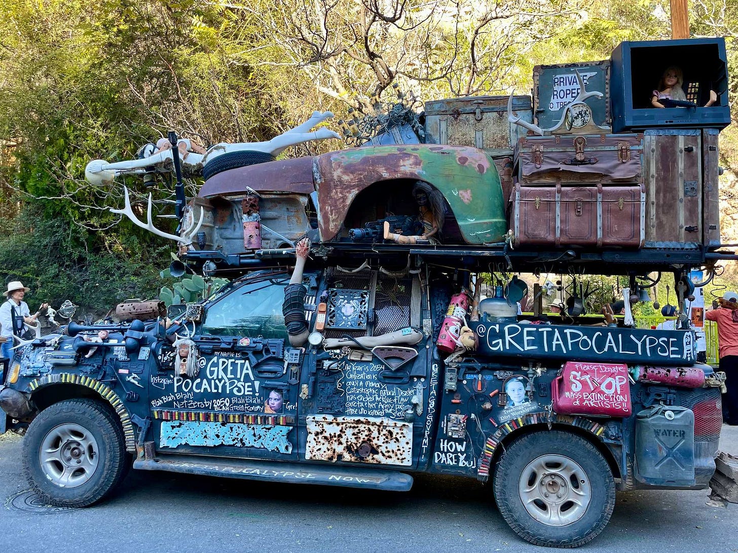When I was in Bisbee, Arizona recently, for the awesome Sidepony Express Music Festival, I encountered the most amazing art vehicle — it’s called “Gretapocalypse,” and is a Greta Thunberg-themed truck that looks like it’s straight out of a Mad Max movie. It’s covered with guns, mannequin limbs, plastic babies, telephone wire, sui…