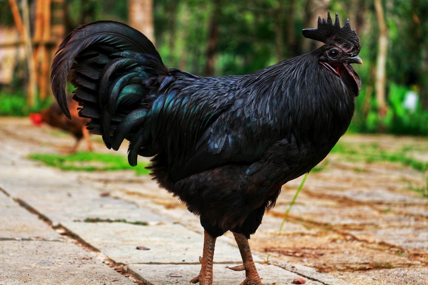 There are guard dogs, and then there are guard chickens, such as the feathered sentry below who won't let the family dog get near his cat mates' food.