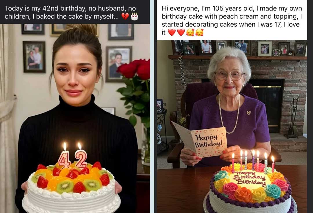 A selfie of tearful 42-year-old woman holding a colorful birthday cake bears the caption "Today is my 42nd birthday, no husband, no children, I baked the cake by myself…" Neither the woman nor the cake is real. It's an AI-generated image designed to turn sympathy into profit on Facebook.