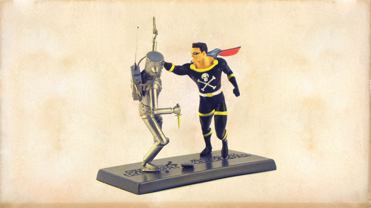 This is The Original Golden Age Black Terror vs. Killer Robot, a miniature based on an old comic cover from the late 1940s. This article will describe how I got this hand painted, limited edition resin statuette produced in China and how you can do the same with your own figures.