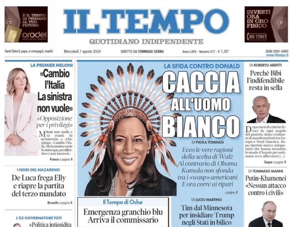The editor of conservative Italian newspaper Il Tempo, having front-paged this mercilessly stupid illustration, now disclaims the obvious mistake it appears to encompass. He's racist, he all but admits, but not ignorant. The headline translates to "Hunting for the white man."