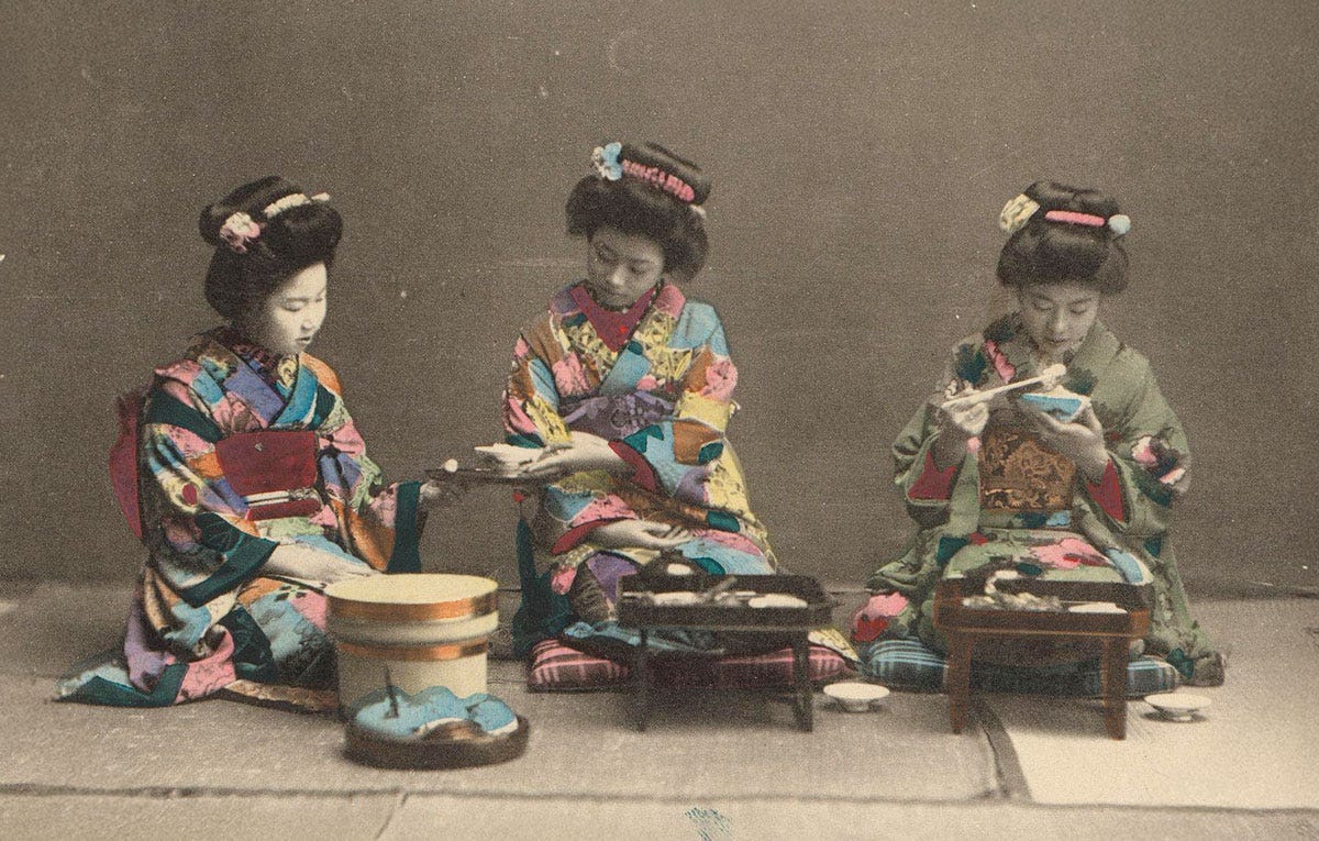Three Japanese Women in Colored Kimonos Eating Rice, anonymous, (1900-1920) public domain