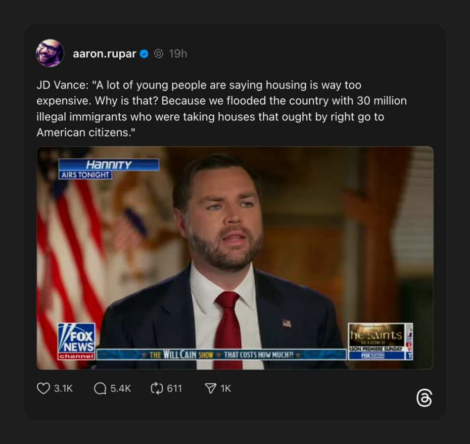 JD Vance employs mental gymnastics blaming housing crisis on immigrants