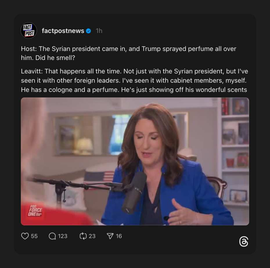 Asked if Trump really sprayed perfume on the Syrian president, Karoline Leavitt didn’t hesitate: “That happens all the time.” Not just Assad, cabinet members, staff, and even the Mouth of Moron herself have apparently been on the receiving end of Trump’s signature scent routine.