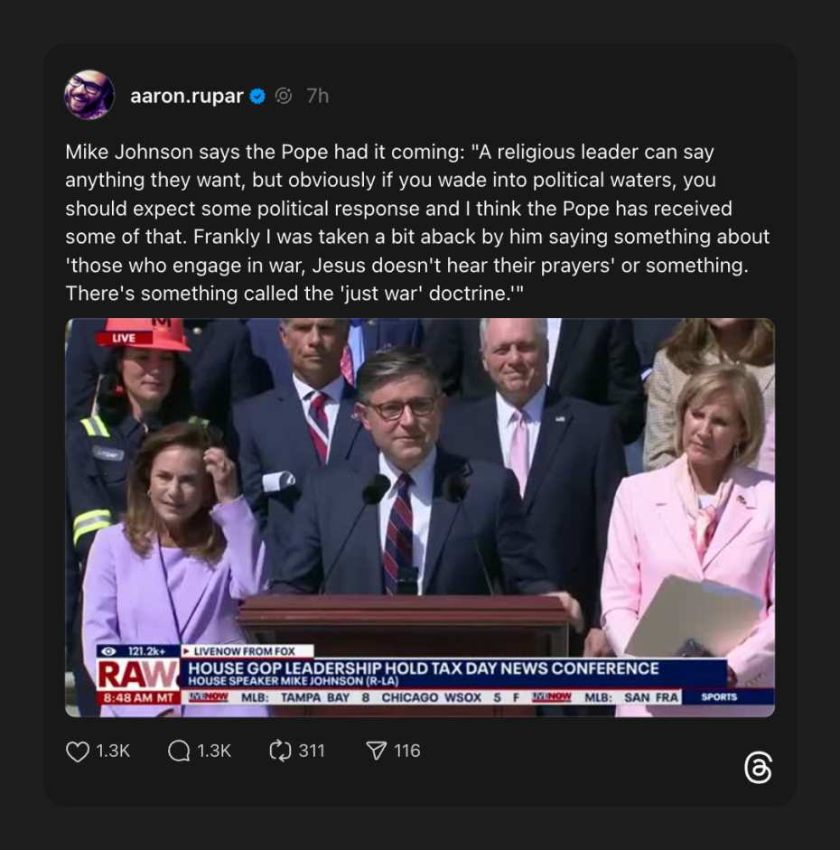 House Speaker by the thinnest margins, Mike Johnson took a moment to explain Christianity to the Pope. Suggesting that while Pope Francis might frown on war, there’s always the handy “just war” doctrine for when the teachings of Jesus become a little inconvenient.