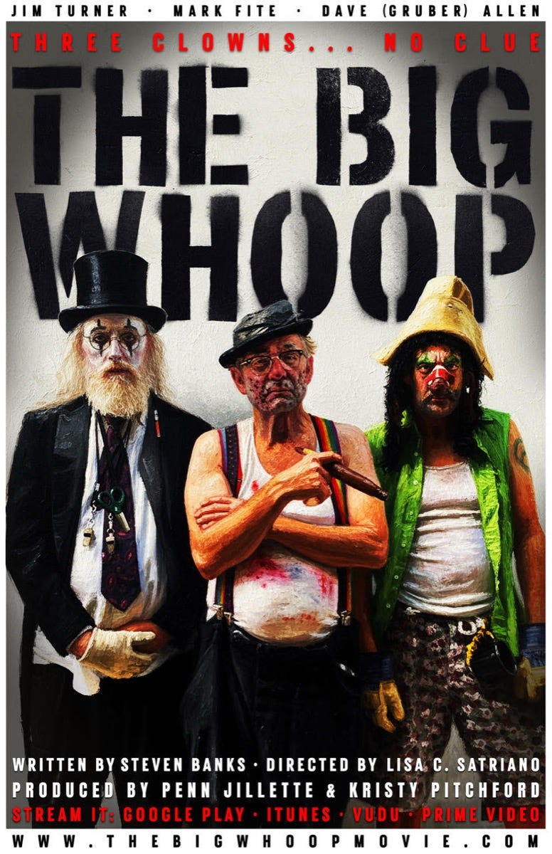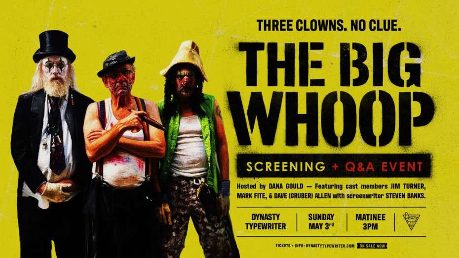The Big Whoop, an indie comedy about a trio of aging, washed-up, birthday party clowns who find a priceless artifact and are pursued by a deadly criminal, screens in its Los Angeles premiere at Dynasty Typewriter May 3 rd. Q&A with the cast. Hosted by comedian Dana Gould.