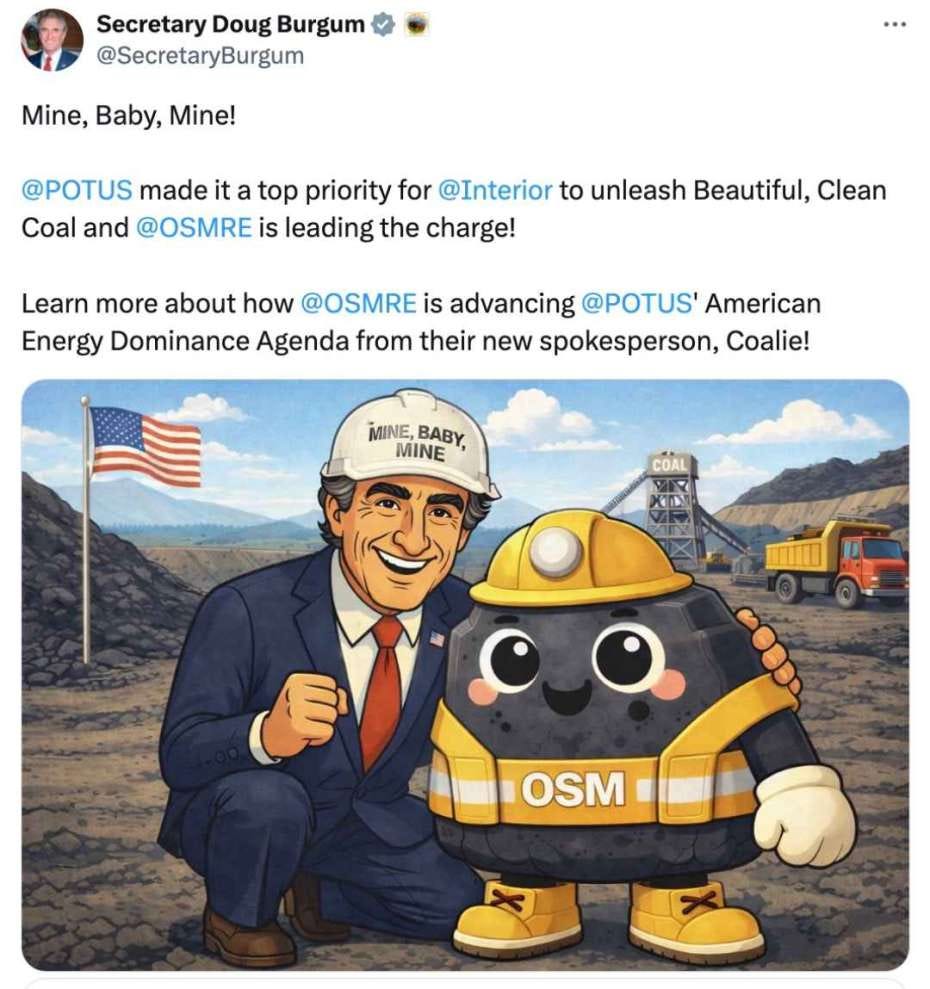 Just as the administration yanked $500 million in funding to clean up abandoned coal mines, Secretary of the Interior Doug Burgum made the social media debut of Coalie. Coalie, a pink-cheeked, googly-eyed lump of coal, is the mascot for the Office of Surface Mining Reclamation and Enforcement.