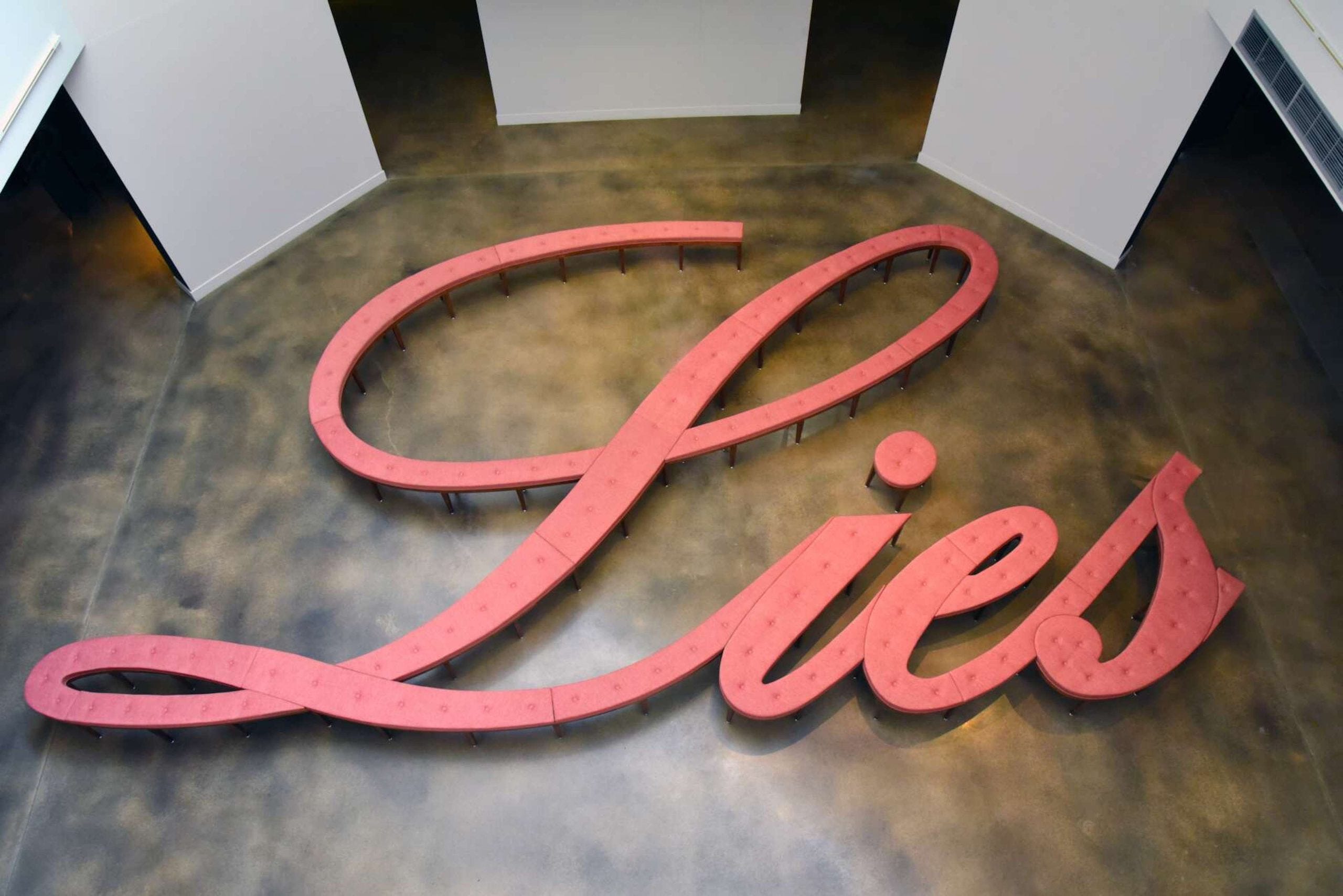 Michael Beitz’s Lies Bench plays with the idea of lies as something we rest upon. Made from dark maple and upholstered in soft salmon-colored chenille, the benches connect to spell “Lies” in loose, cursive lettering. Their simple, elegant design makes them feel comfortable and familiar, like furniture meant to be used. From above, the word becomes fully…