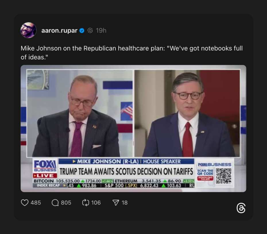 Get ready for skyrocketing healthcare prices and likely worse care from our for-profit healthcare system. MAGA Mike Johnson swears the party has “notebooks full of ideas“ for a new healthcare plan, which is a clever way of saying they have notebooks but no plan.