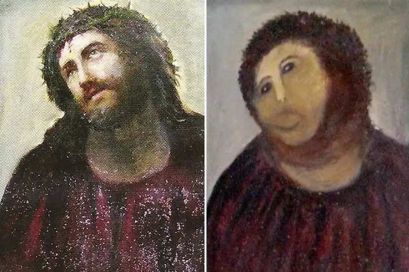 Cecilia Giménez, who so amazingly botched a restoration of a fresco depicting Jesus Christ that it and she became internationally famous, is dead at 94. The parishioner from Borja, Spain, set out to restore the faded and peeling icon 13 years ago, having gotten permission to do so from the priest. The resulting subject, nicknamed “Monkey Jesus…