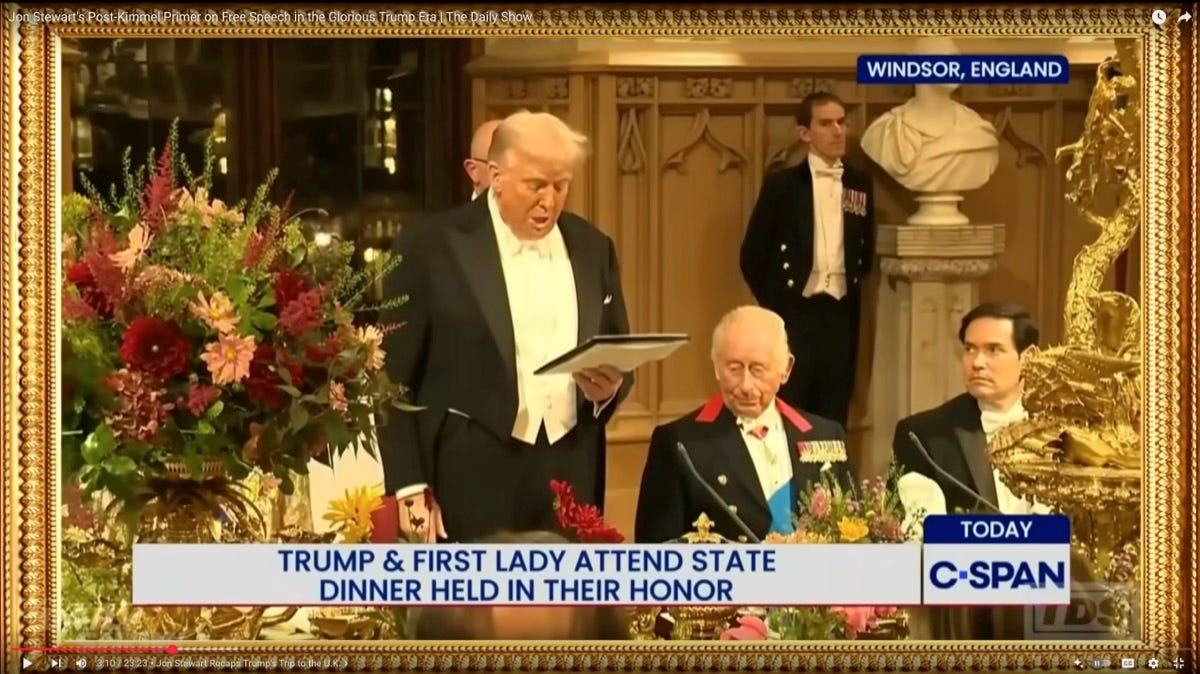 From last night's Daily Show: "A humble, obedient Jon Stewart heaps praise upon America's Glorious Leader, Donald J. Trump, and provides an FCC-approved refresher on the rules of free speech in the wake of Jimmy Kimmel's suspension. Plus, the TDS News Team serenades the world's greatest, large-penised leader."