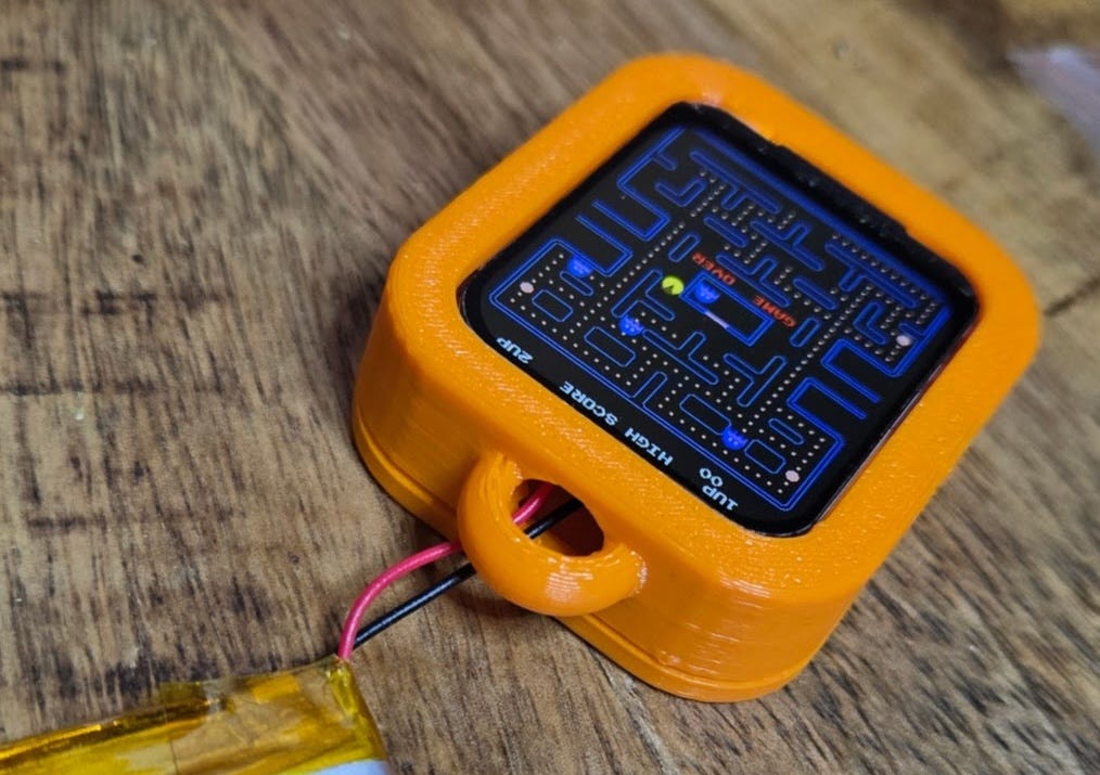 Pelletino is a tiny handheld Pac-Mac arcade game you play by tilting it. It runs the original 1980 arcade ROM under emulation on a 32-bit RISC-V ESP32-C6 microcontroller, wedded to a 240×280 ST7789 LCD and a six-axis inertial measurement unit to detect movements. The faithful recreation gets smooth 60 FPS gameplay on ~$3…