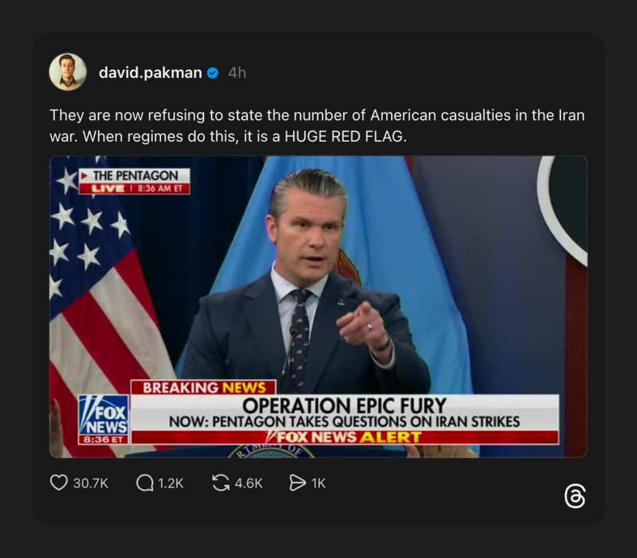 furthermore, hegseth says the strait of Hormuz is entirely open and there's no need for any military contingency on that issue, if one (just) ignores that Iran is targeting any shipping through there[1] [:gobsmacked emoji:]