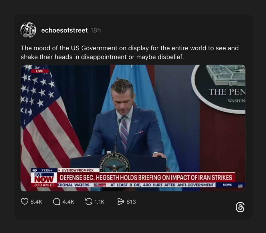 A near-screaming at the press Secretary of “War” literally tried the oldest trick in the wall-selling playbook, insisting you get behind the war because “the troops.” I would gather the troops are also curious as to why their lives are put at risk.