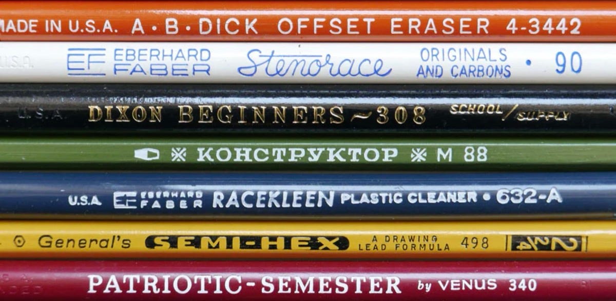 Present & Correct, the London-based purveyor of fine stationery and vintage office supplies, has assembled a gallery of beautiful lettering found on pencil shafts. The collection showcases how different manufacturers and eras have rendered text on these humble writing instruments.