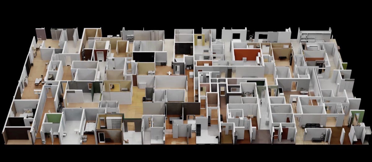 Researchers have created WorldGrow, an AI system that generates endless 3D environments by stitching together procedurally created rooms and hallways. The result looks exactly like what you’d get if you fed an algorithm a dataset of generic office furniture and apartment layouts, then asked it to build forever.