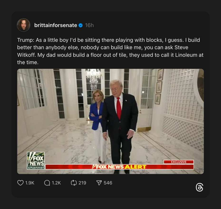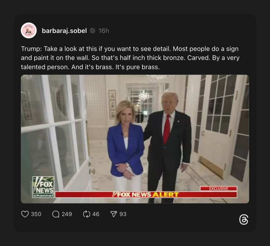 What was once the people’s house now feels like a prop set for his endless reruns of grievance and glory. Every chandelier becomes a monument to ego, every story retold as proof that the nation’s heritage shines brightest under his nameplate.