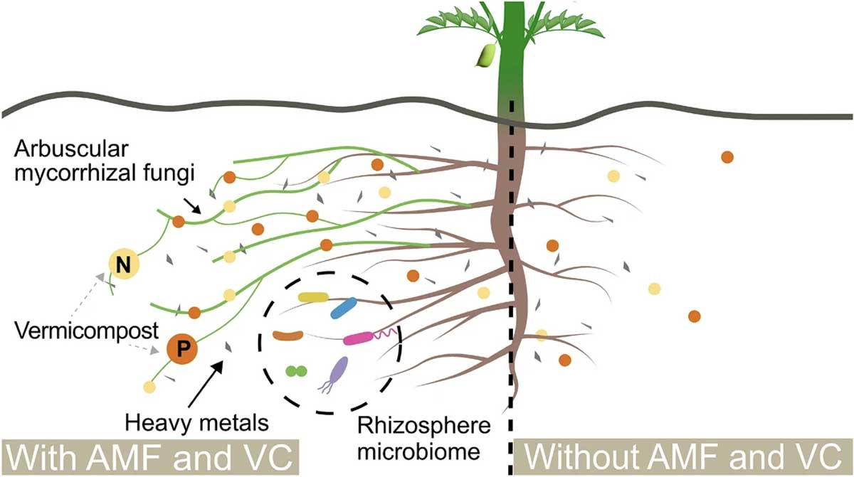 Chickpea roots with beneficial fungi (left) spread wider, absorb more nutrients and water, and block harmful heavy metals. Without the fungi (right), roots are shorter and less protected. Worm compost feeds the soil with microorganisms and nutrients the plant needs to grow. (https://doi.org/10.1038/s41598-026-35759-0)