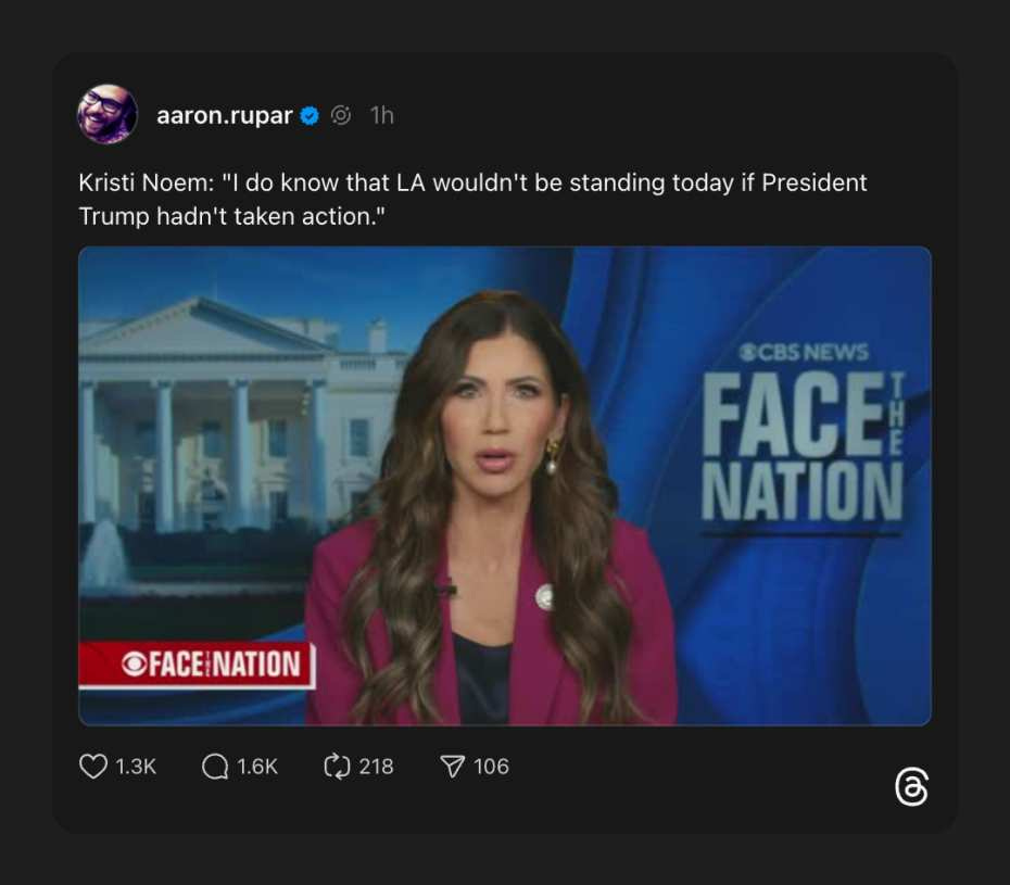 Kristi "Puppy Slayer" Noem lives in a different reality than the rest of us. Trump didn't do anything to help with the fires, and the violence Downtown was almost entirely police violently attacking citizens.