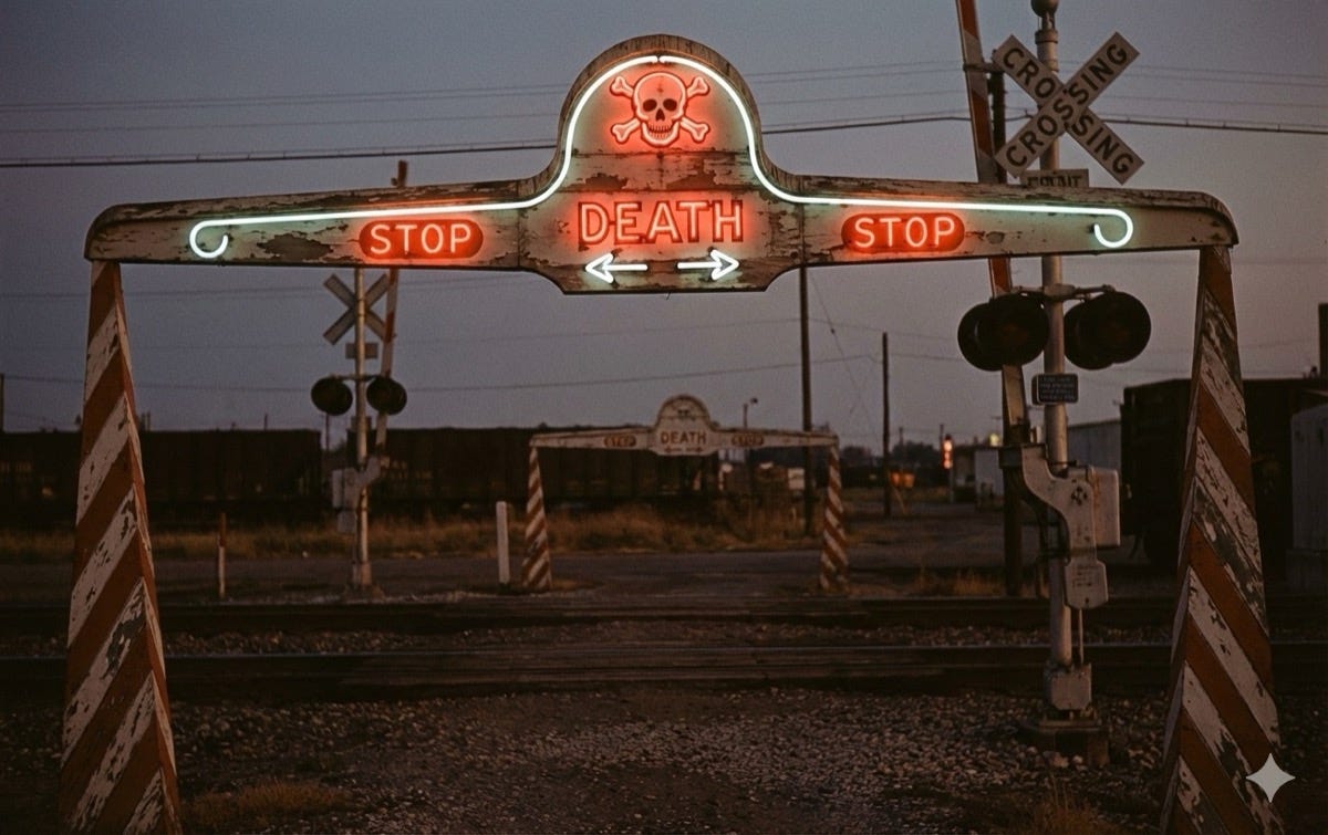“STOP – DEATH – STOP” a gloriously excessive 1930s railroad crossing signal