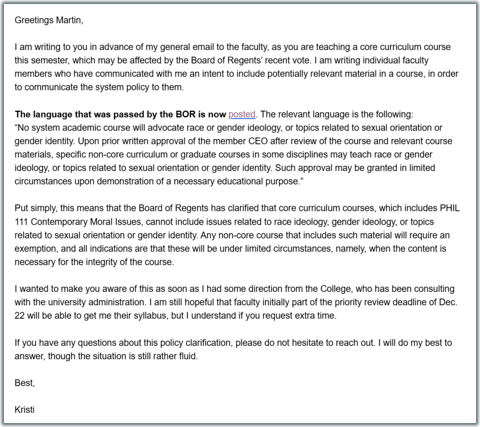 Professor Peterson had been contacted by his chair on December 19th about the review of syllabi for Contemporary Moral Problems courses. Here’s that email:
