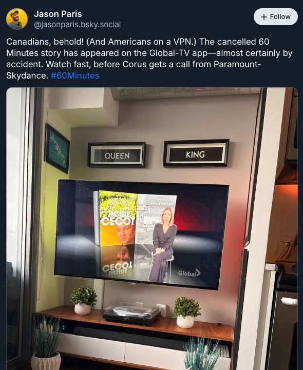 Bari Weiss apparently yanked a 60 Minutes piece on Venezuelan migrants deported to El Salvador’s CECOT prison because it was not friendly enough to the Trump Administration. Somehow, the piece aired in Canada anyway.